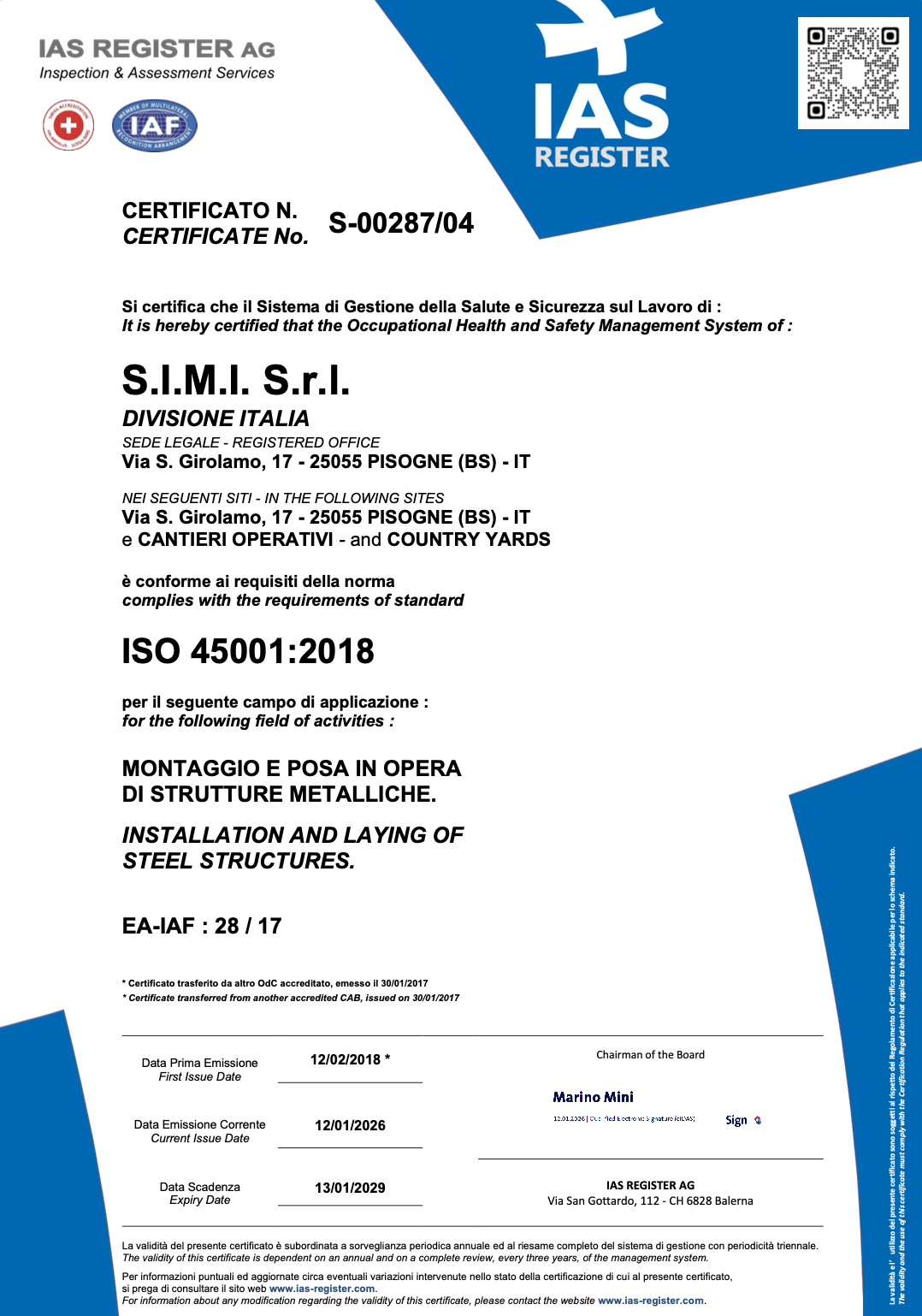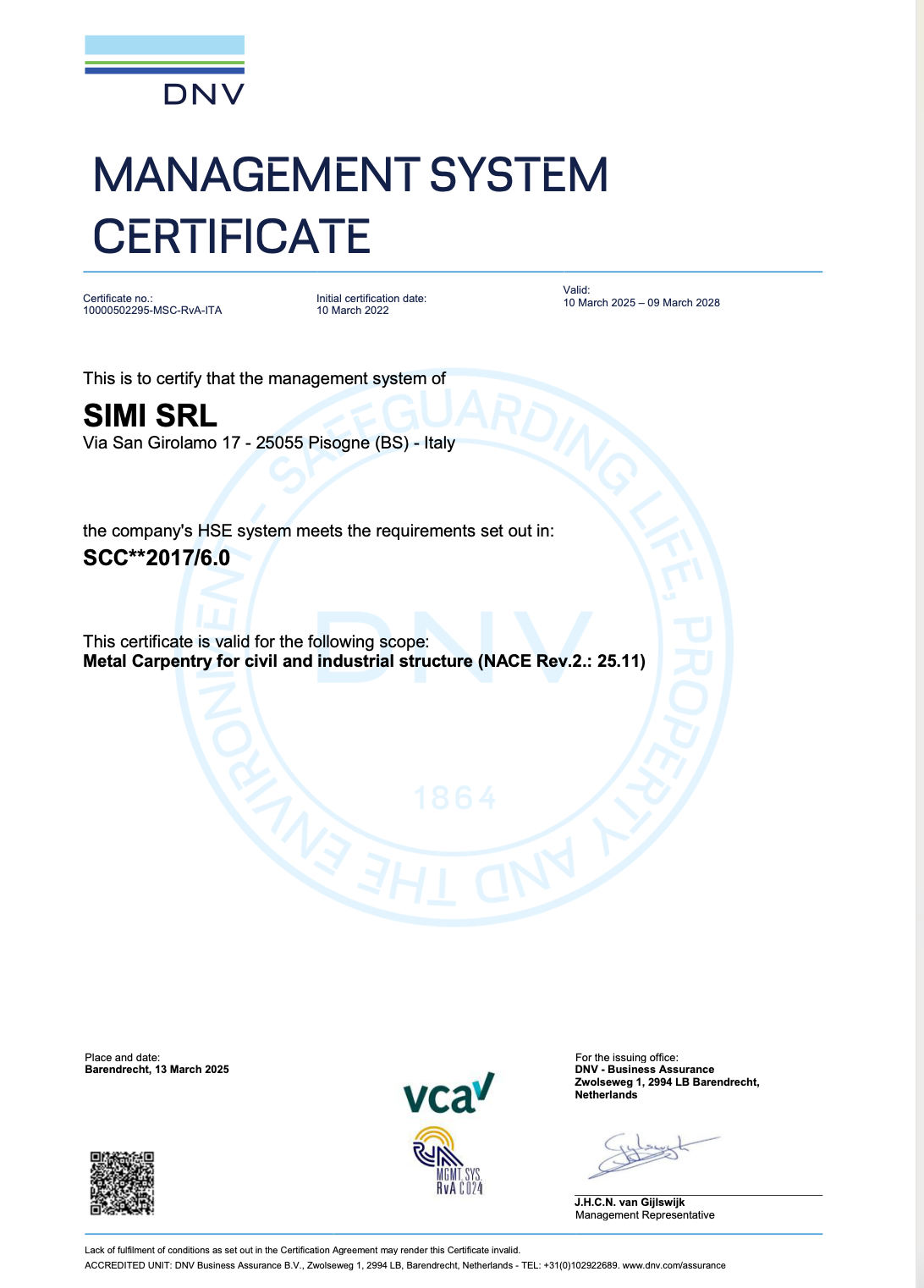 La certificazione SCC attesta che l’azienda applica un sistema di gestione conforme agli standard internazionali in materia di salute, sicurezza sul lavoro e tutela dell’ambiente.